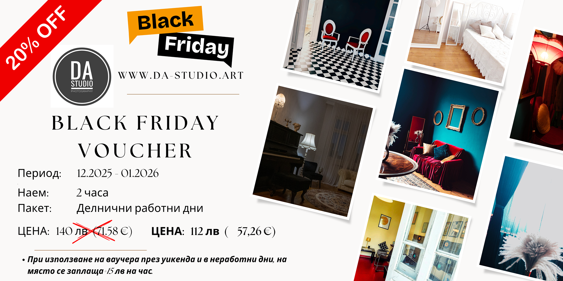 Само в периода 28–30.11.2025 можете да закупите промоционални ваучери за наем на фотостудиото с 20% или 30% отстъпка.
