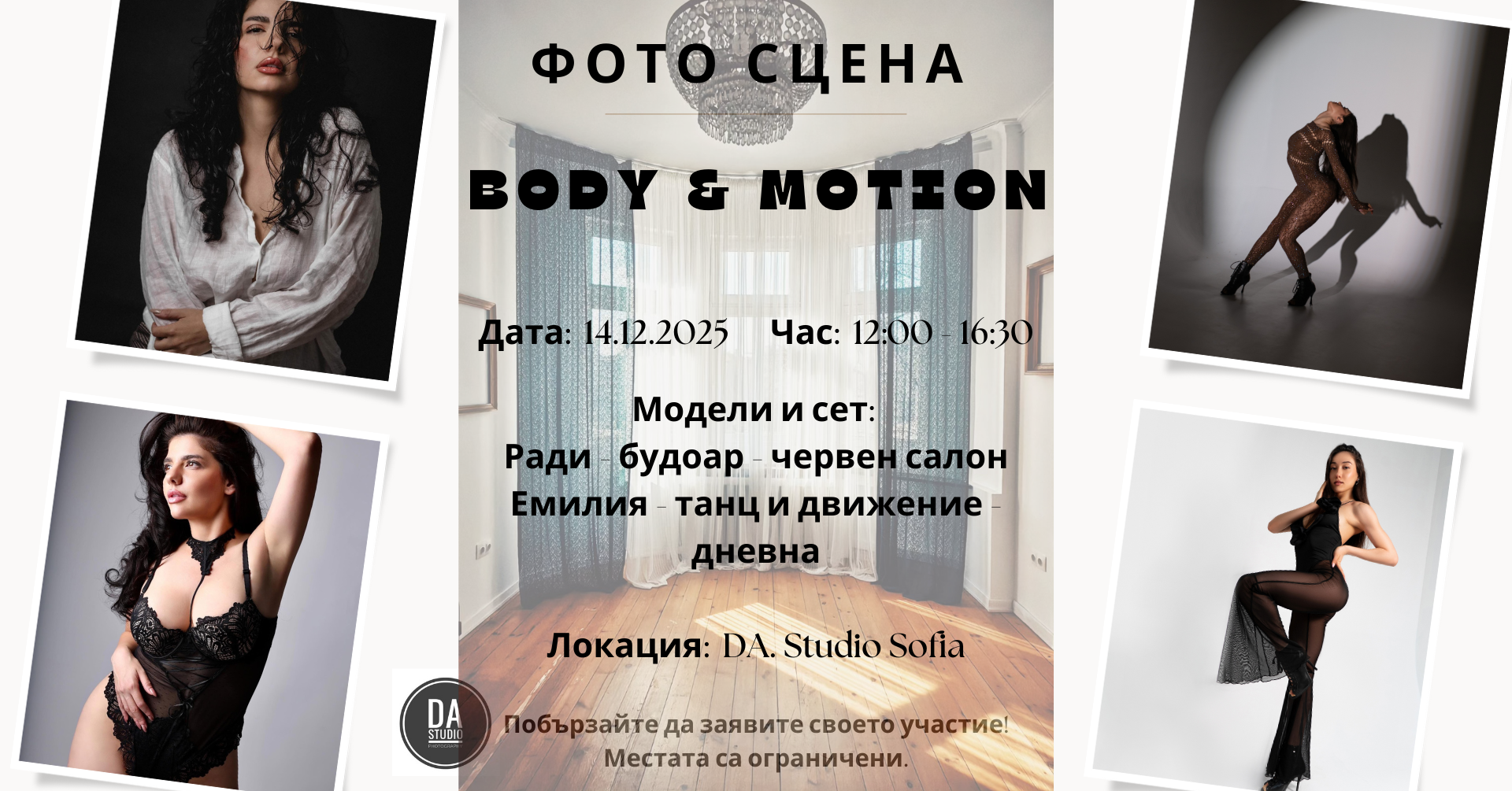 Два забележителни модела ще ви посрещнат в студиото, за да ви потопят в пространство, където грацията среща чувствеността. Ще имате възможност да развиете уменията си както в улавянето на тяло в движение и танцови форми, така и в създаването на интимни кадри с тиха, елегантна будоарна естетика.