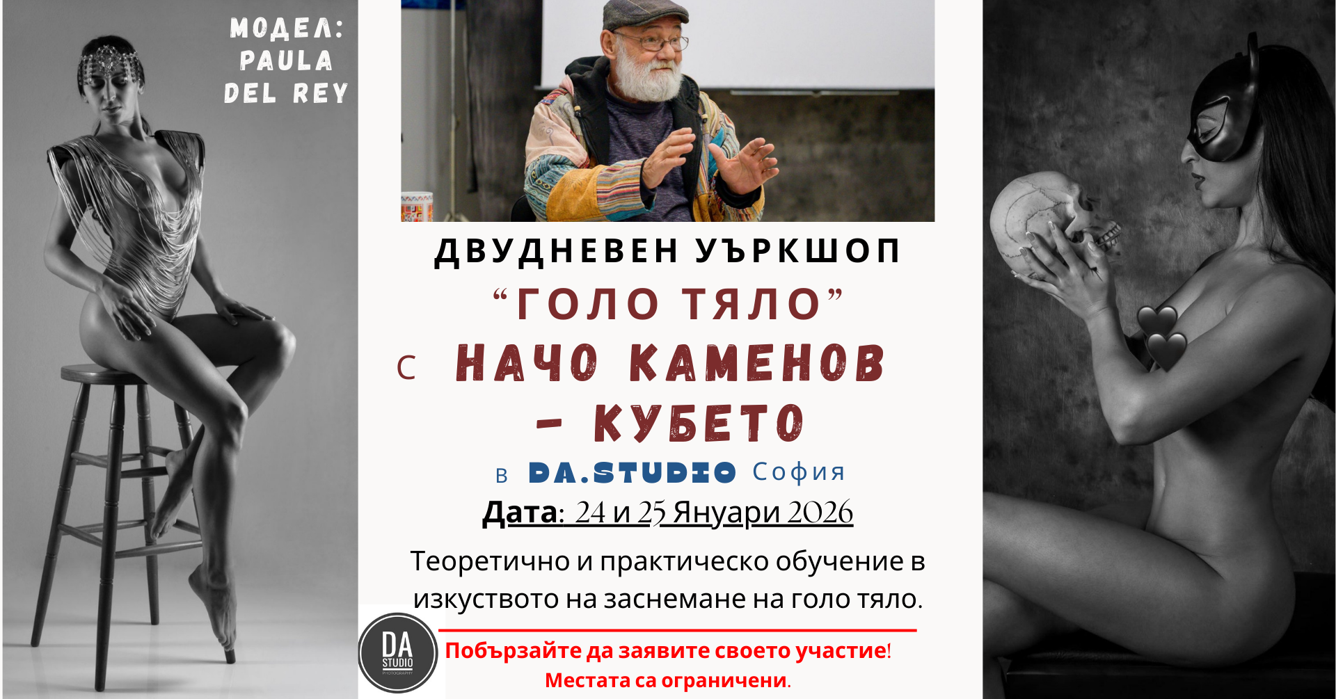 Започваме 2026 година силно и вдъхновяващо — с гостуването на една от емблематичните фигури в българската art nude фотография Начо Каменов-Кубето, заедно с неговата муза, изключителната Паула Дел Рей.